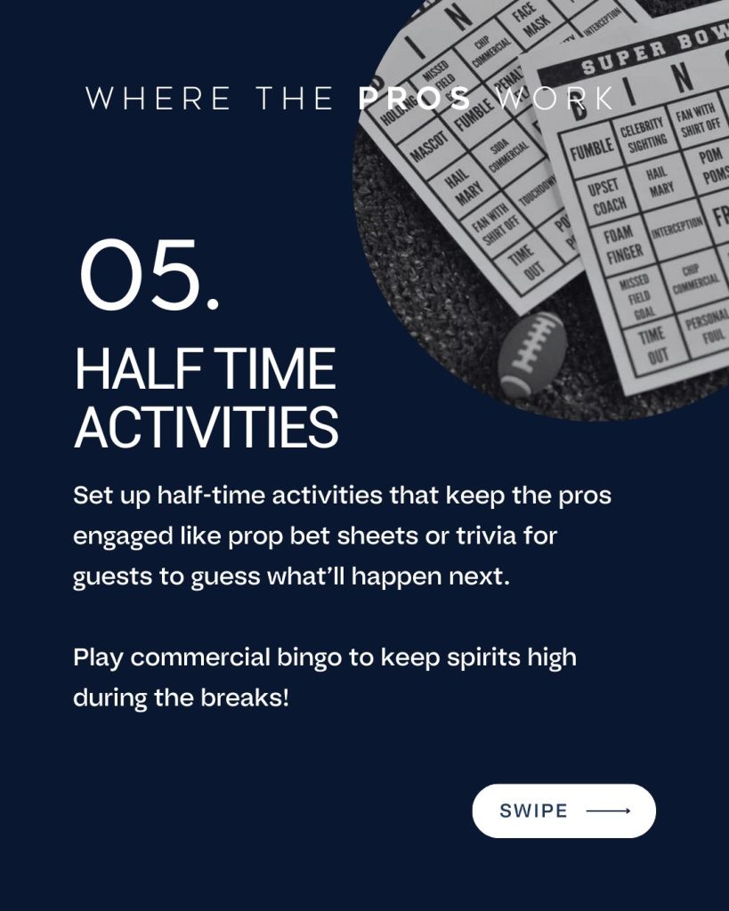 - Soft lighting and music to create an inviting atmosphere before kickoff and during breaks.